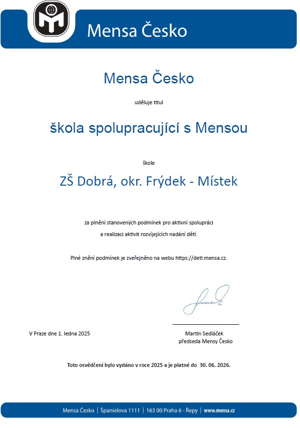 Mensa Česko uděluje titul škola spolupracující s Mensou škole ZŠ Dobrá, okr. Frýdek-Místek.